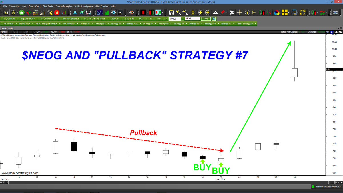 "PULLBACK" STRATEGY #7 GENERATED 2 BUY SIGNALS AND CAUGHT THE RECENT LOW IN $NEOG. Strategy #7 is one of our premier "Pullback" methods that's designed to buy near the lows of a up-trending market. Only at http://ProTraderStartegies.com (All signals for student education only)