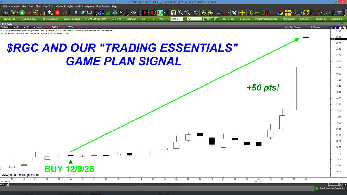 OUR NEW "TRADING ESSENTIALS" GAME PLAN GENERATED A BUY SIGNAL IN $RGC A MONTH AGO! This is a brand new course that's built on 2 of our most powerful indicators. Includes entries, exits, stops & is ONLY available at http://ProTraderStrategies.com (All signals for student education only)