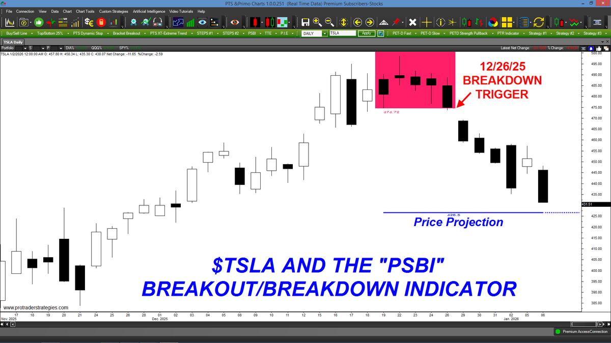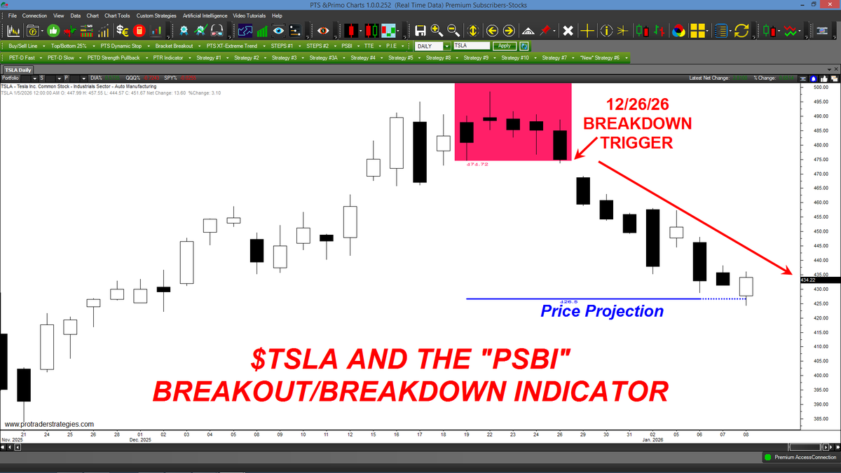 IT TOOK LESS THAN 2 WEEKS FOR $TSLA TO REACH IT'S "PSBI" BREAKDOWN PRICE PROJECTION! If you're still struggling in the markets, the "PSBI" can turn your trading around in 2026! Contact http://ProTraderStrategies.com for more info/discounts (All signals for student education only)