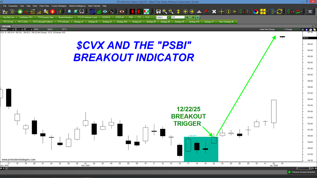 THE PRICE OF $CVX IS UP SHARPLY TODAY BUT OUR "PSBI" INDICATOR TRIGGERED A BREAKOUT WEEKS AGO! If you're still struggling in the markets, the "PSBI" can turn your trading around in 2026! Contact http://ProTraderStrategies.com for more info/discounts (Signals for student education only)
