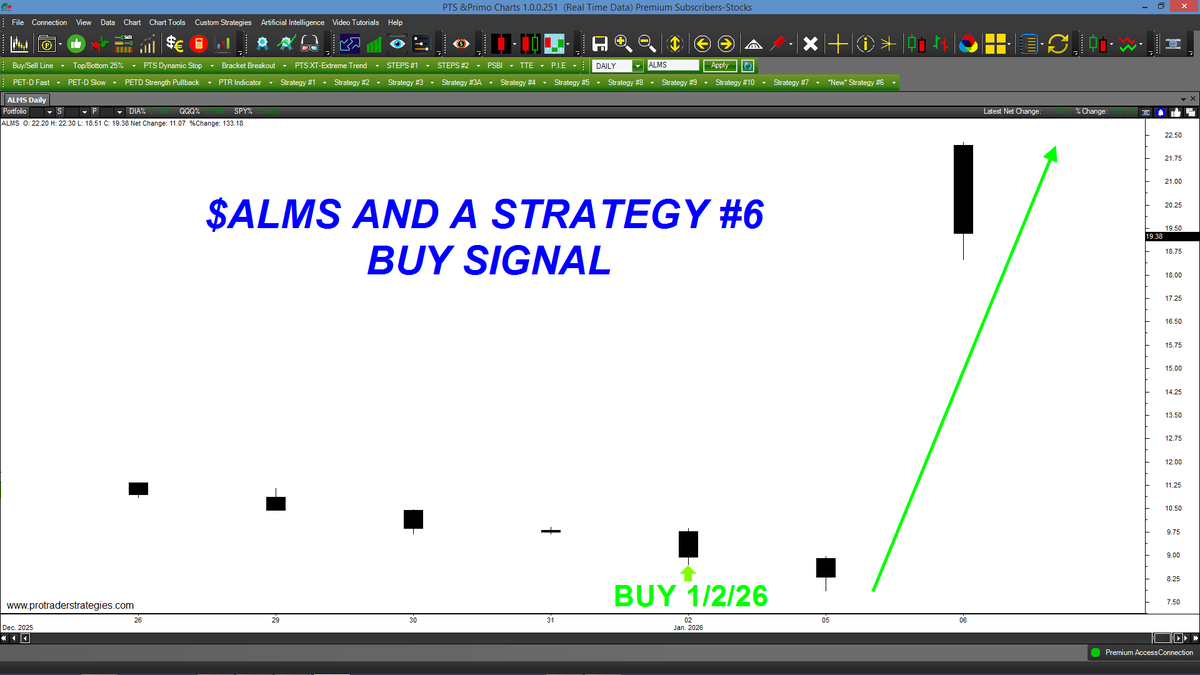 ANOTHER WINNING STRATEGY #6 SIGNAL, THIS TIME IN $ALMS! If you're the type of trader who doesn't want to stay in trades for more than 1-5 days, contact http://ProTraderStrategies.com & ask about our new short-term Strategy #6 for ALL markets (All signals for student education only)