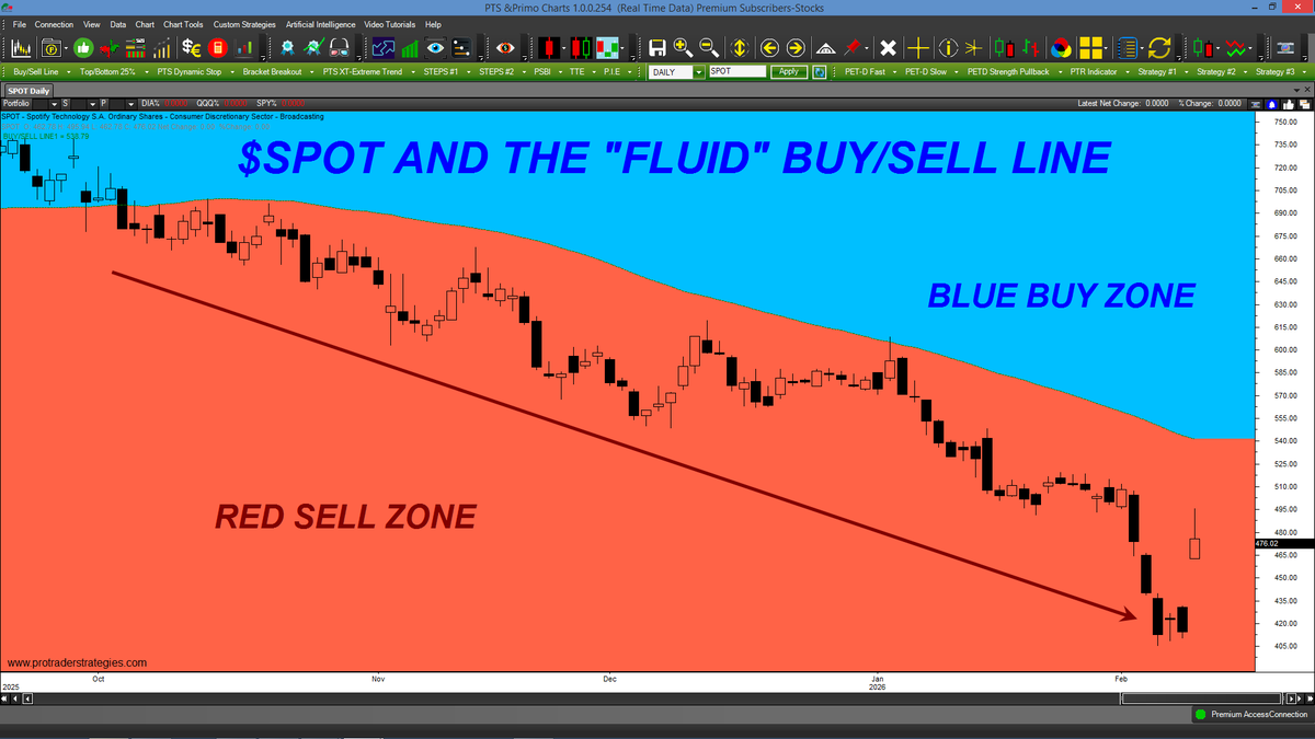 DESPITE YESTERDAY'S BOUNCE, $SPOT REMAINS IN THE SELL ZONE. You only lose money when you're out-of-sync with whatever market you're trading. The "Fluid" Buy/Sell Line was designed to align you with the markets. Only at http://ProTraderStrategies.com (Signals for student education only)