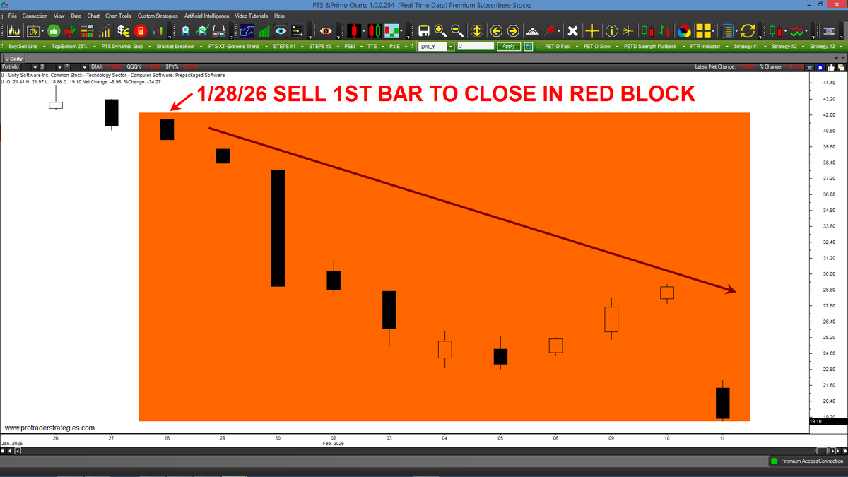 THE PTS-XT ALERTED OUR STUDENTS TO SELL/EXIT $U WEEKS AGO! The PTS-XT has only 1 job: to identify "extreme trends" in advance - that's it! This powerful tool is available ONLY at http://ProTraderStrategies.com (Signals for student education only)
