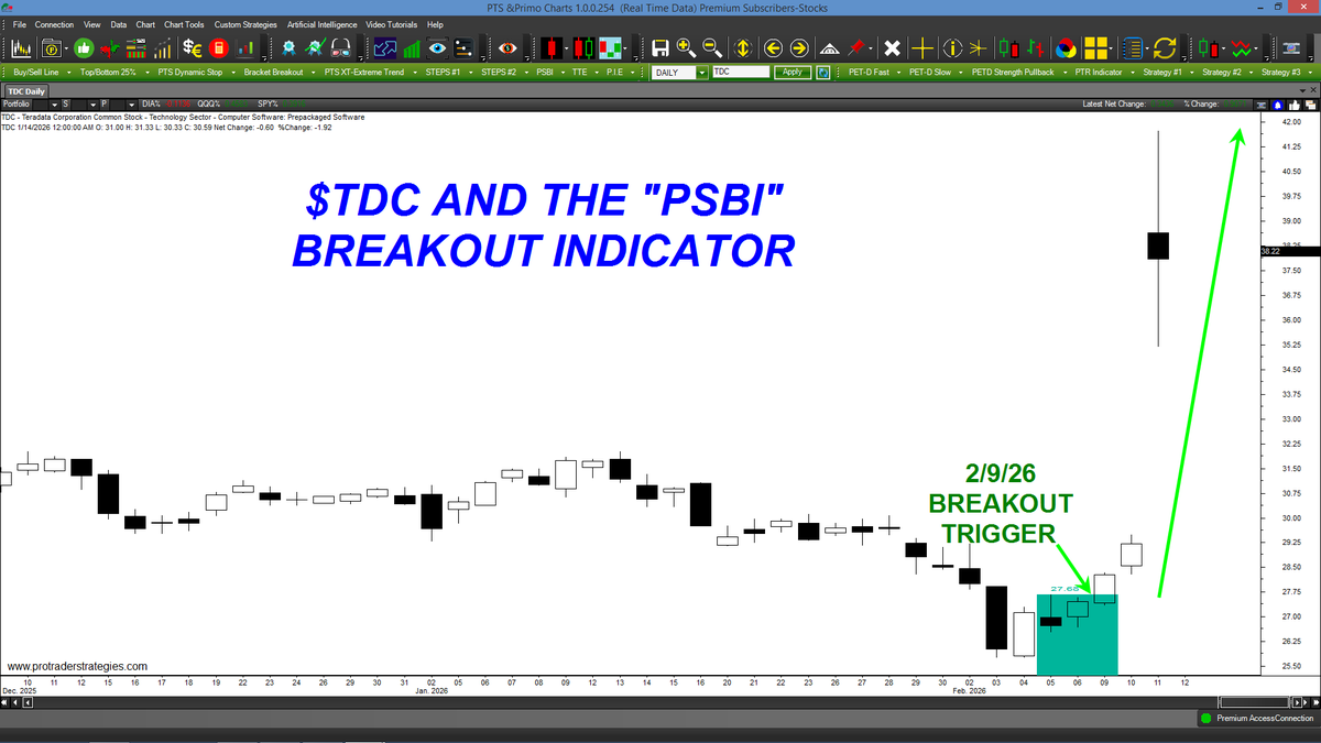 THE PRICE OF $TDC JUMPED +15 PTS JUST 3 DAYS AFTER THE "PSBI" TRIGGERED A BREAKOUT. Do you now see why the "PSBI" is one of our most popular indicators? Contact http://ProTraderStrategies.com and start trading with the "PSBI" today! (All signals for student education only)