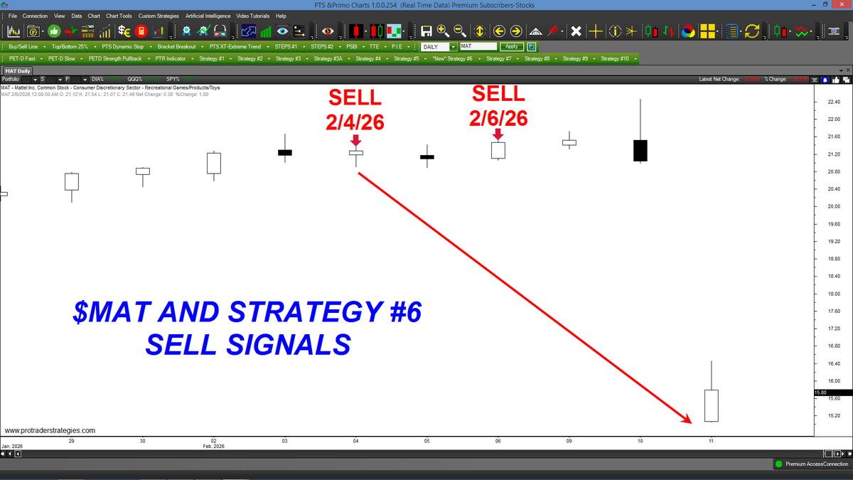 STRATEGY #6 WARNED OUR STUDENTS TO SELL/EXIT $MAT IN ADVANCE OF A SELL-OFF. This method was designed for short-term traders with signals usually lasting only 1-5 days. Strategy #6 is only available at http://ProTraderStrategies.com (All signals for student education only)