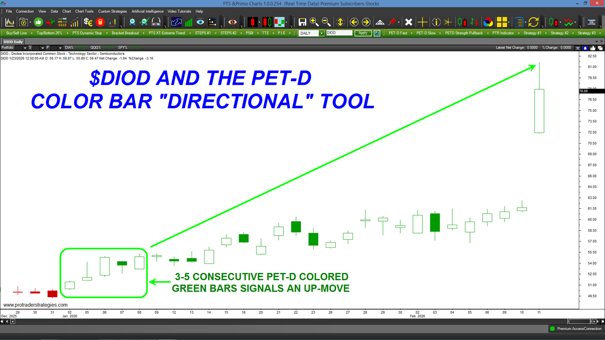 THE PRICE OF $DIOD IS SOARING BUT THE PET-D SIGNALED AN UP-MOVE MONTHS AGO! 3-5 consecutive PET-D colored green bars signals an up-move in ANY market or time frame. The ORIGINAL PET-D color bar tool is only found at http://ProTraderStrategies.com (All signals for student education only)