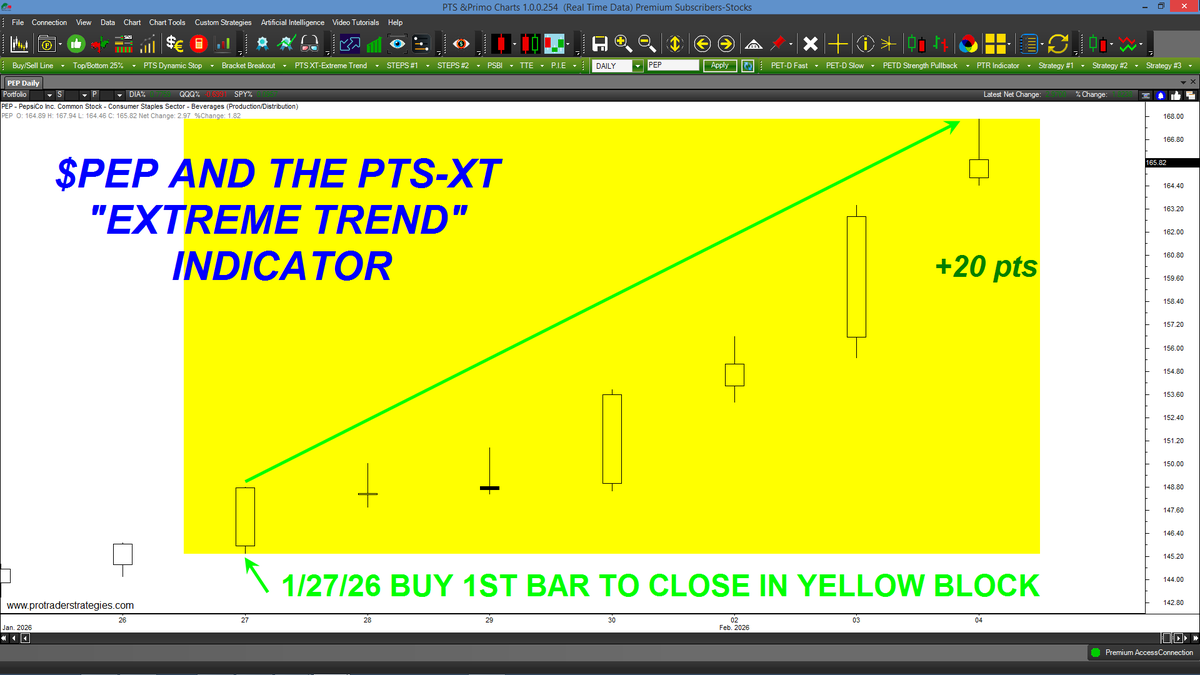 THE PRICE OF $PEP CONTINUES TO RISE BUT OUR PTS-XT INDICATOR GENERATED A BUY SIGNAL WEEKS AGO! Our students love this trending tool because of it's simplicity: buy the 1st bar to close in the yellow block - that's it! Only at http://ProTraderStrategies.com (Signals for education only)