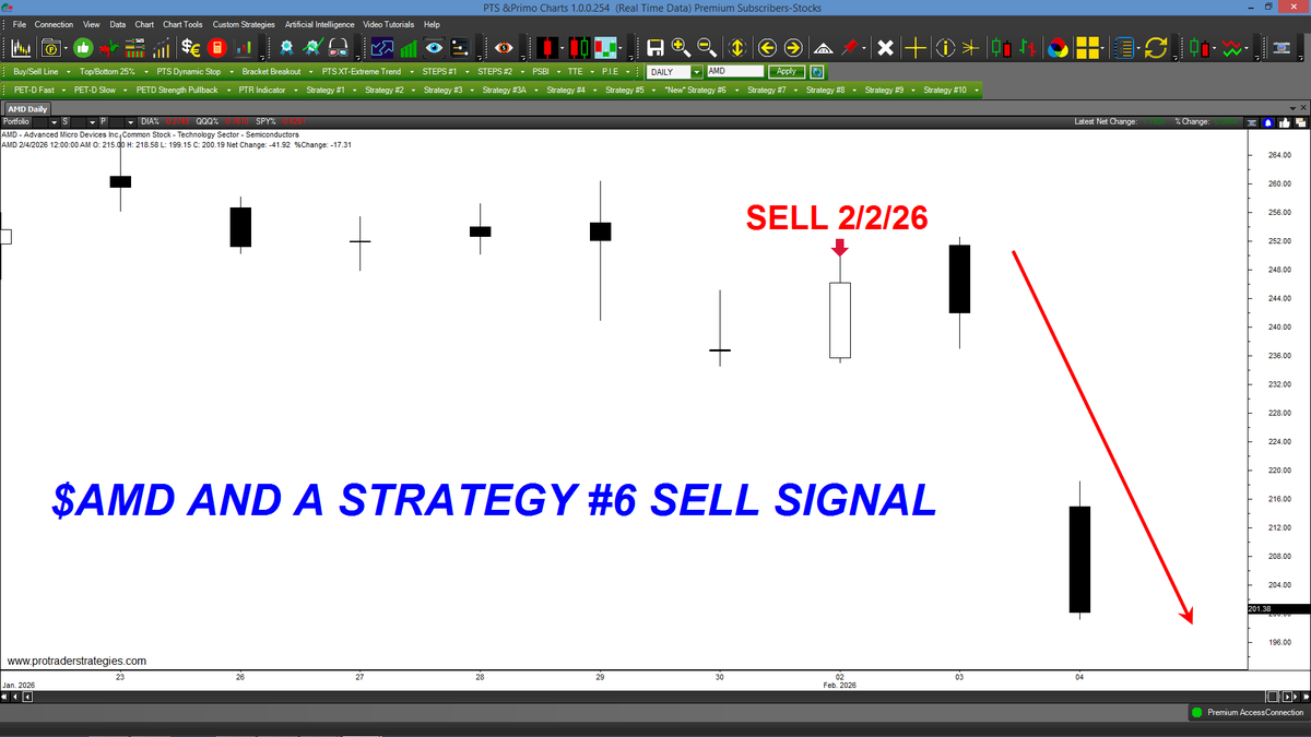 THE PRICE OF $AMD HAS DROPPED -45 PTS SINCE STRATEGY #6 GENERATED A SELL SIGNAL 2 DAYS AGO. This method was designed for short-term traders with signals usually lasting only 1-5 days. Strategy #6 is only found at http://ProTraderStrategies.com (All signals for student education only)