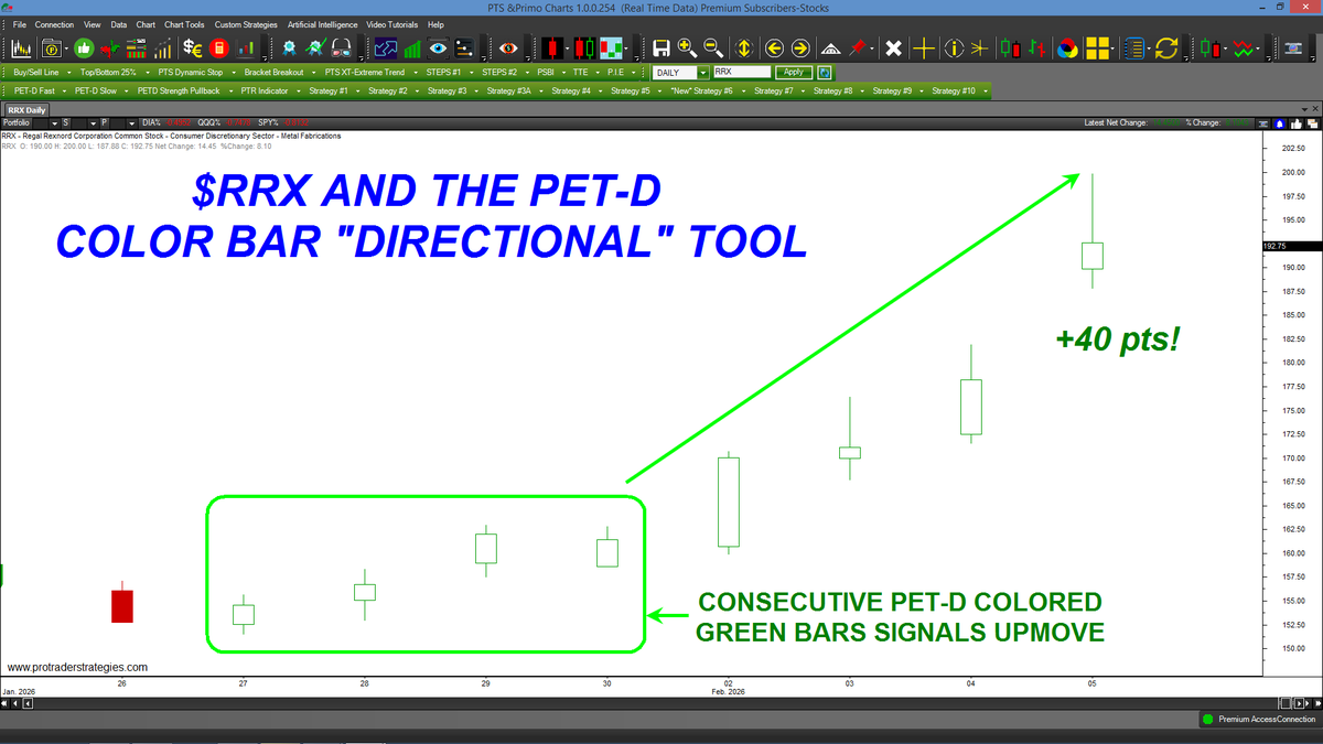 THE PET-D COLOR BAR TOOL SIGNALED AN UP-MOVE IN $RRX LAST WEEK. 3-5 consecutive PET-D colored green bars signals an up-move in ANY market/time frame. The ORIGINAL PET-D color bar tool is only found at http://ProTraderStrategies.com (All signals for student education only)