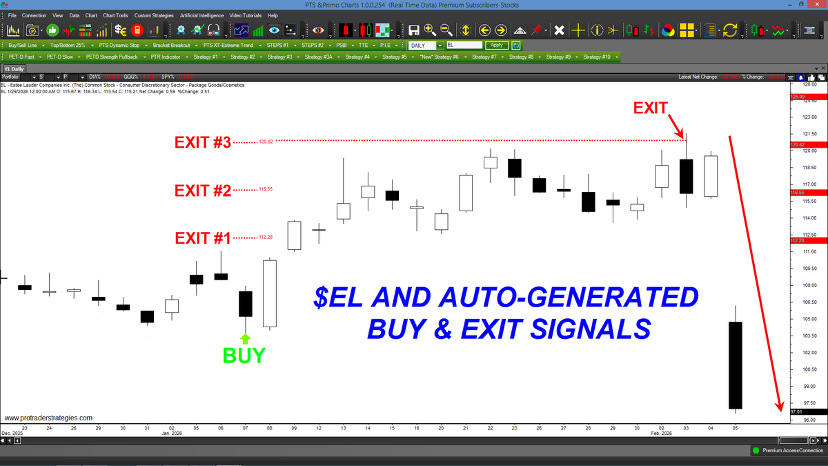 DID YOUR STRATEGY HAVE YOU EXITING $EL BEFORE TODAY'S BIG DROP? All our strategies come equipped with auto-displayed buy & exit signals for simplicity in trading. Available ONLY on the PTS Primo Charting Platform at http://ProTraderStrategies.com (All signals for student education only)