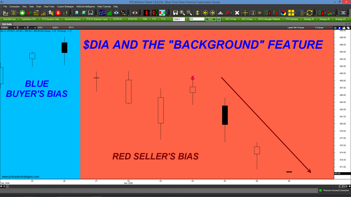 OUR STUDENTS KNEW TO SELL/EXIT THE MARKET AND $DIA DAYS IN ADVANCE! The "Background" Feature was designed to instantly identify the overall trend of ANY market/time frame & can ONLY be found on the PTS Primo Charts at http://ProTraderStrategies.com (All signals for education only)