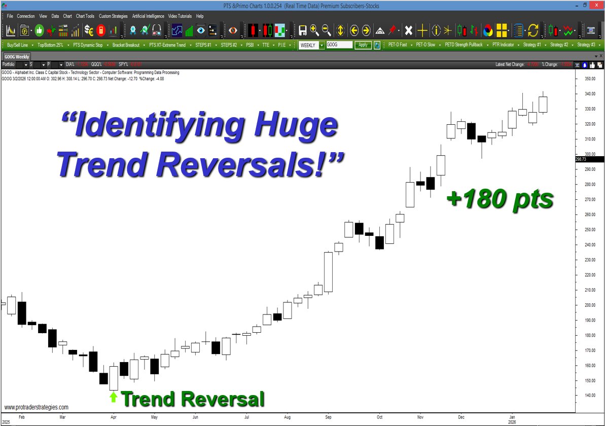 WOULD YOU LIKE TO LEARN HOW TO IDENTIFY TREND REVERSALS LIKE THE ONE BELOW IN $GOOG? Please join me this Wed at 10am PST for a free webinar on "Identifying Huge Trend Reversals!" I'll show you a reversal tool that our students are raving about. Sign up at: http://www.ProTraderStrategies.com