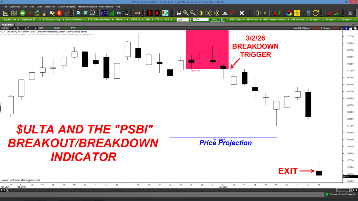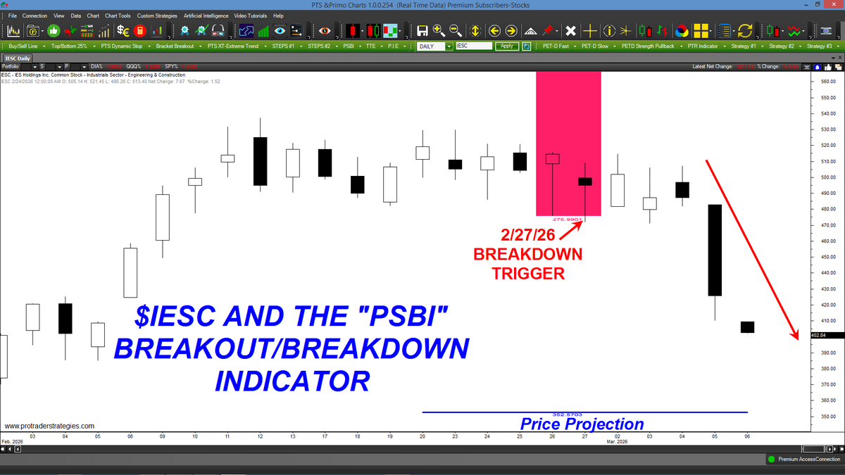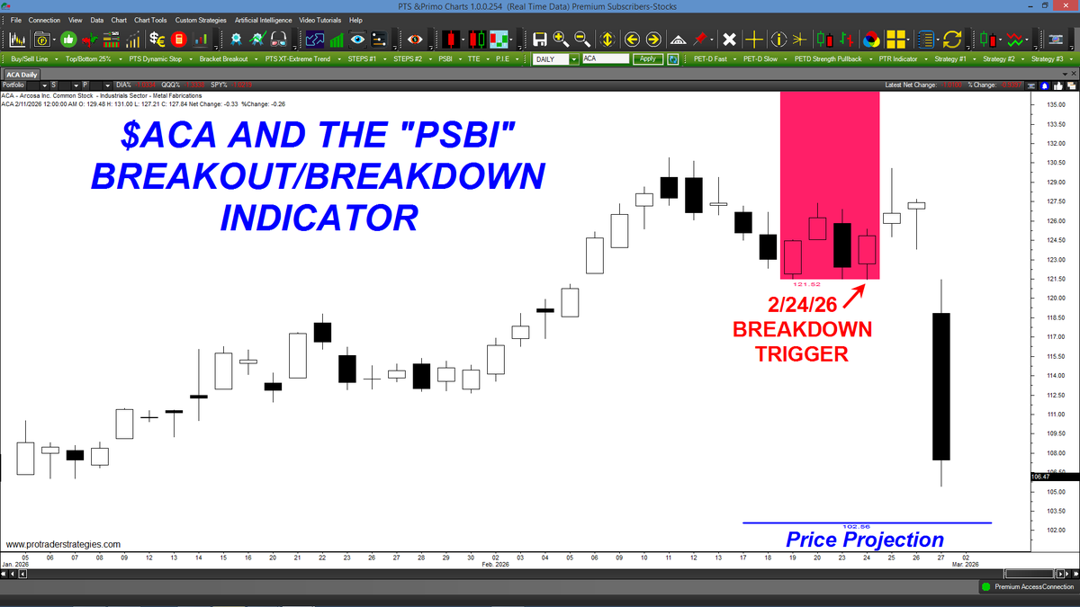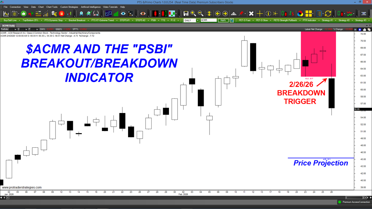 A "PSBI" BREAKDOWN WAS TRIGGERED TODAY WITH PRICE PROJECTION IN $ACMR. Whenever the "PSBI" Indicator triggers a breakout or breakdown, a price projection is also displayed. Available ONLY on the PTS Primo Charting Platform at http://ProTraderStrategies.com (Signals for education only)