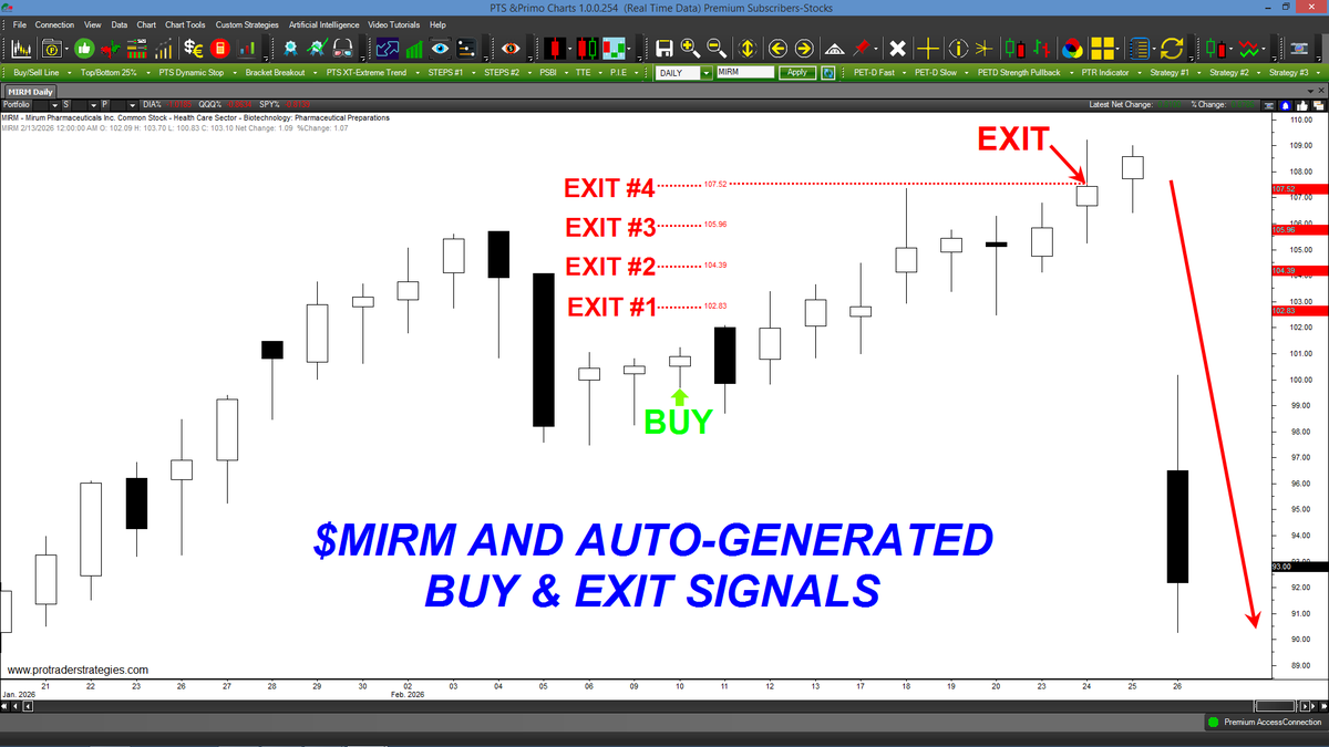 STUDENTS WHO TOOK THE BUY SIGNAL IN $MIRM WERE ABLE TO LOCK IN PROFITS W/ OUR EXIT SIGNALS. If you're still struggling in the markets our auto-display buy & exit signals can turn your trading around! Contact http://ProTraderStrategies.com for more info (All signals for education only)