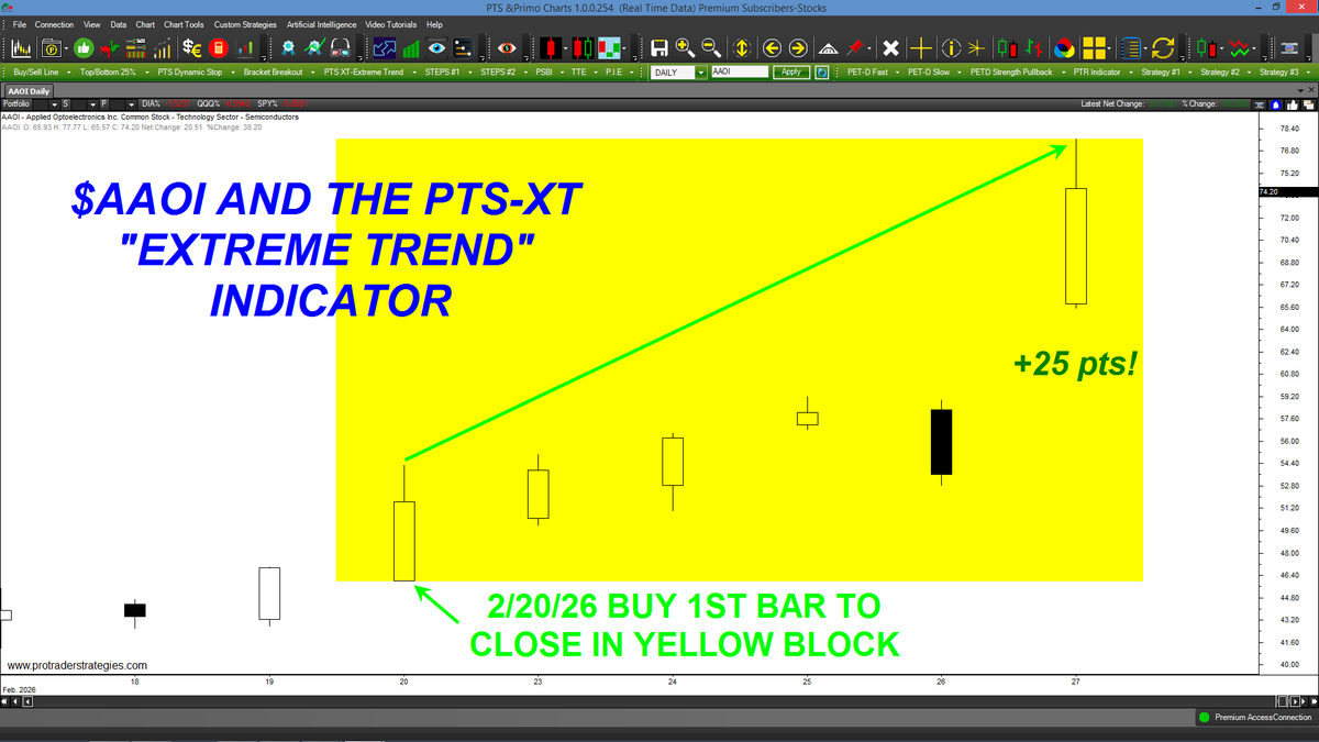 ANOTHER WINNING PTS-XT SIGNAL, THIS TIME IN $AAOI! This powerful tool has only 1 job: to identify extreme trends in advance. Find out why our students around the world love this indicator, available ONLY at http://ProTraderStrategies.com (All signals for student education only)