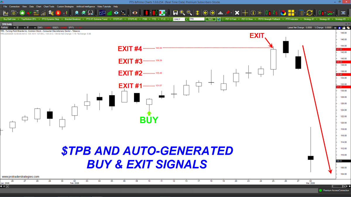 OUR EXIT SIGNALS PROVIDED STUDENTS W/ 4 CHANCES TO EXIT $TPB BEFORE IT FELL -35 PTS! All our strategies come equipped w/ auto-displayed buy & exit signals for simplicity in trading. Available ONLY on the PTS Primo Charts at http://ProTraderStrategies.com (All signals for education only)