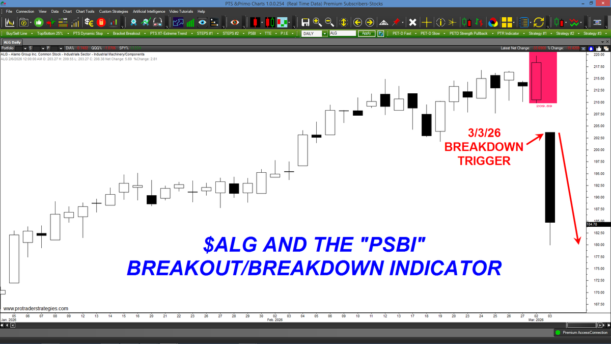 A 'PSBI" BREAKDOWN WAS TRIGGERED YESTERDAY IN $ALG AND THE STOCK IS -25 PTS LOWER! Stop wasting time & money on trading methods that just don't work. Contact http://ProTraderStrategies.com & start trading with the powerful "PSBI" today! (All signals for student education only)