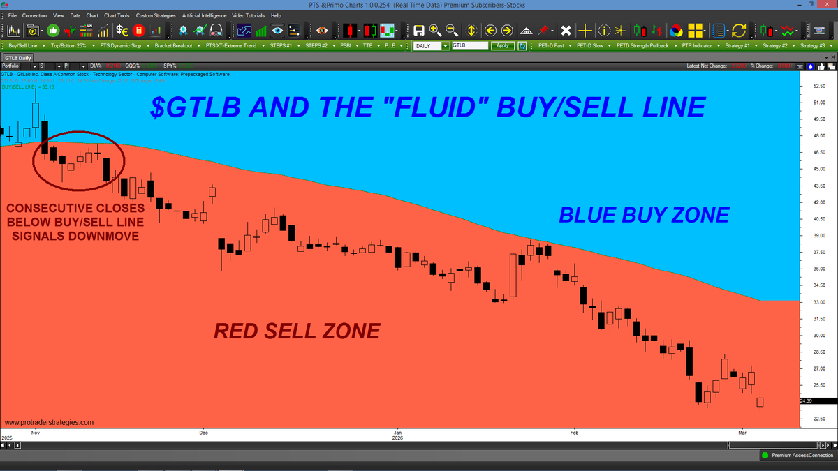OUR STUDENTS KNEW TO SELL/EXIT $GTLB MONTHS AGO! You only lose money when you are out-of-sync with whatever market you're trading. Our Buy/Sell Line can help. Available ONLY on the PTS Primo Charting Platform at http://ProTraderStrategies.com (All signals for student education only)