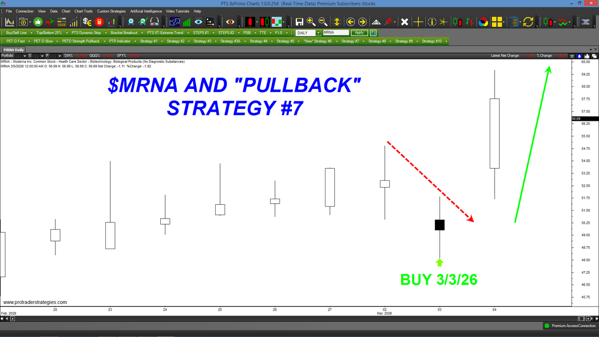 "PULLBACK" STRATEGY #7 CAUGHT THE MOST RECENT LOW IN $MRNA. Strategy #7 is designed to generate buy signals at or near short-term lows in ALL markets & time frames. This powerful method is ONLY available at http://ProTraderStrategies.com (All signals for student education only)