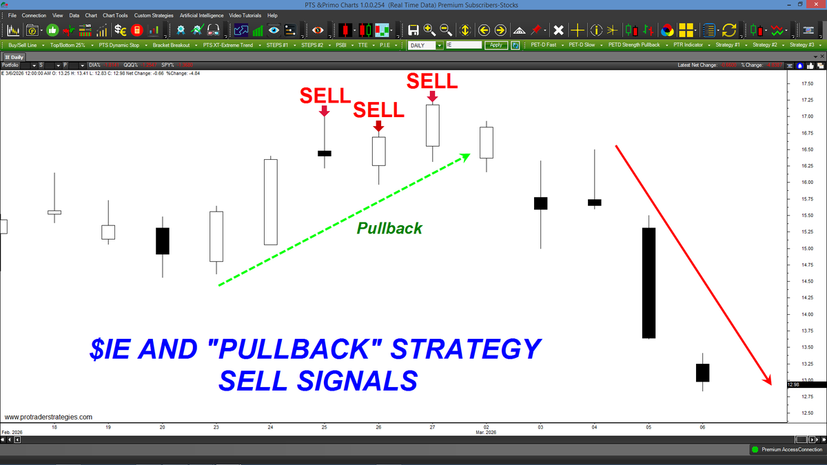 OUR "PULLBACK" STRATEGIES GENERATED SELL/EXIT SIGNALS NEAR THE MOST RECENT HIGHS IN $IE. Contact http://ProTraderStrategies.com & ask about our many consistent "Pullback" methods for all markets & time frames (All signals for student education only)