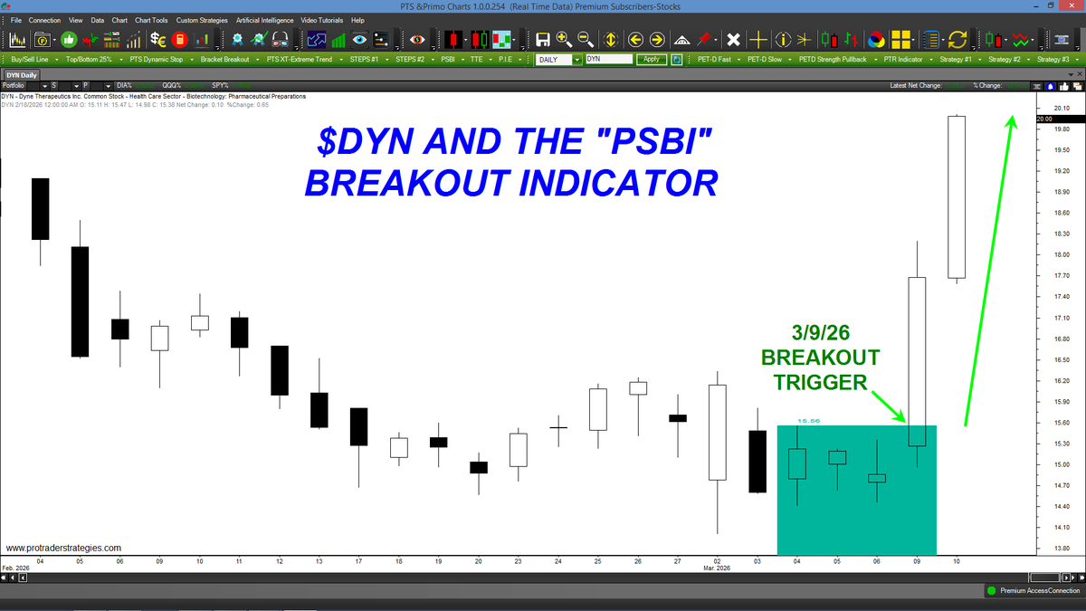 ANOTHER WINNING "PSBI" BREAKOUT, THIS TIME IN $DYN! Do you now see why our students around the world absolutely love this breakout indicator? Turn your trading around & contact http://ProTraderStrategies.com to get the powerful "PSBI" indicator today (All signals for education only)