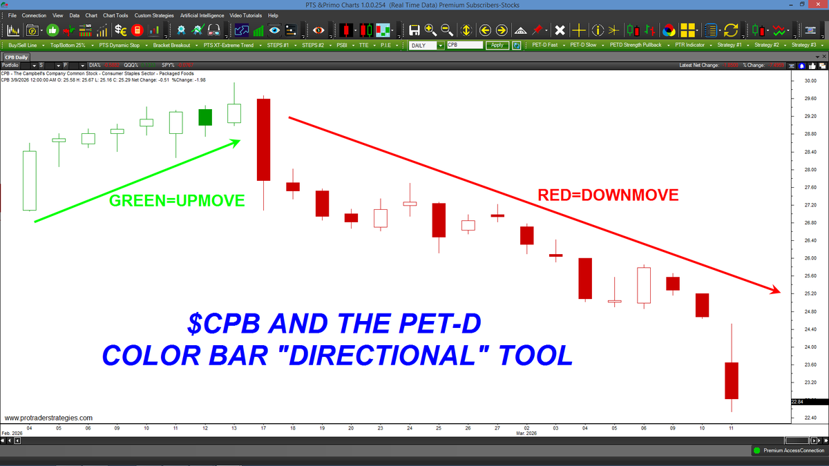 DO YOU THINK OUR PET-D COLOR BAR TOOL COULD HAVE HELPED YOU TRADE $CPB? 3-5 consecutive PET-D bars of the same color signals a short-term move in ANY market or time frame. The ORIGINAL PET-D is only found at http://ProTraderStrategies.com (All signals for student education only)