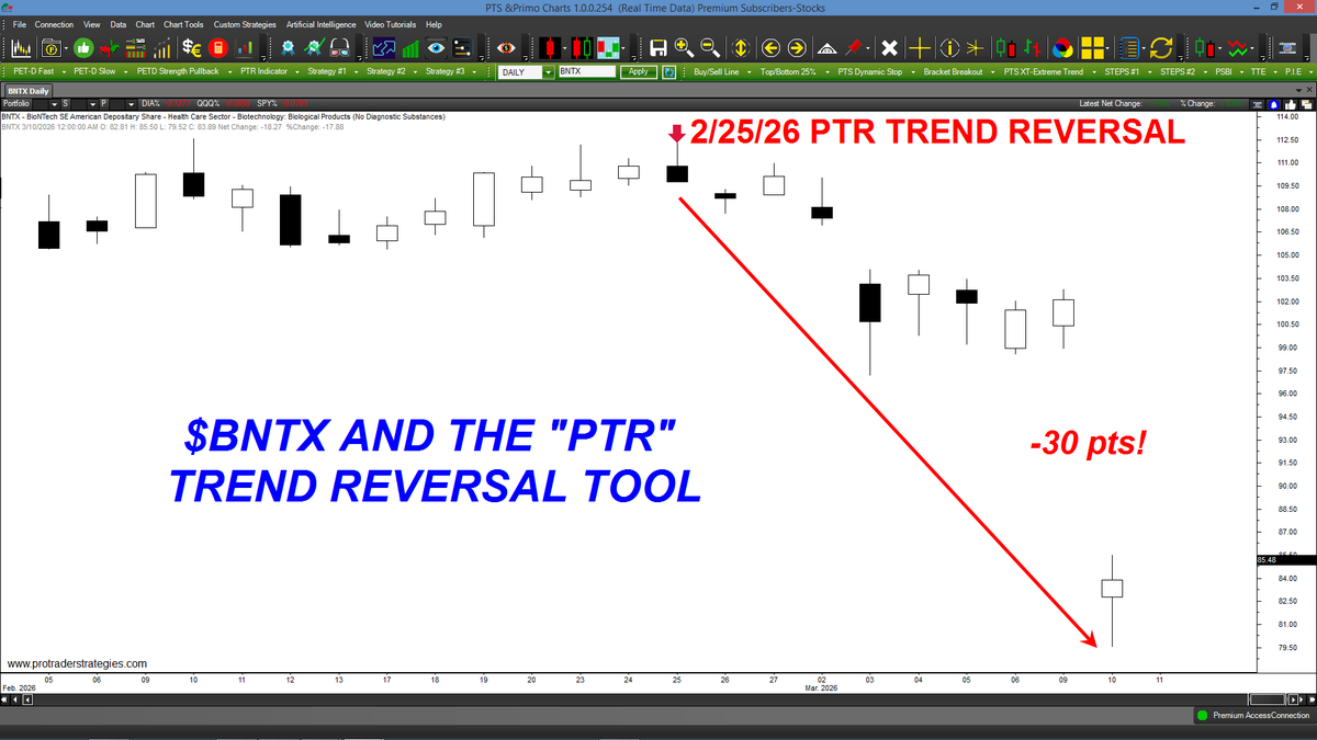THE PRICE OF $BNTX HAS FALLEN -30 PTS SINCE THE "PTR" GENERATED A TREND REVERSAL SIGNAL. Would you like to know w/ high probability when a trend reversal was about to take place? Contact http://ProTraderStrategies.com & get the "PTR" indicator today! (Signals for student education only)