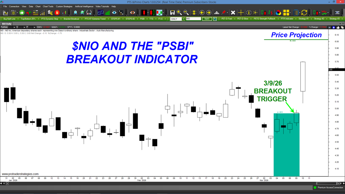A "PSBI" BREAKOUT WAS TRIGGERED IN $NIO 2 DAYS AGO! A breakout is triggered once price trades above the green displayed area and a price projection is auto-displayed. The "PSBI" is only found on the PTS Primo Charts at http://ProTraderStrategies.com (Signals for student education only)