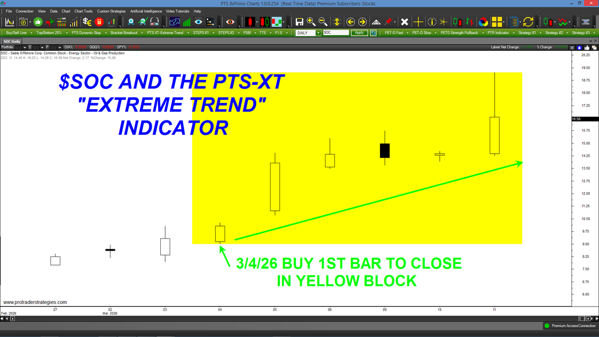 THE PRICE OF $SOC HAS JUMPED +90% JUST 1 WEEK AFTER THE PTS-XT SIGNALED AN EXTREME UPTREND! This powerful indicator has only 1 job: to identify extreme trends in advance! The ORIGINAL PTS-XT is only found at http://ProTraderStrategies.com (Signals for student education only)