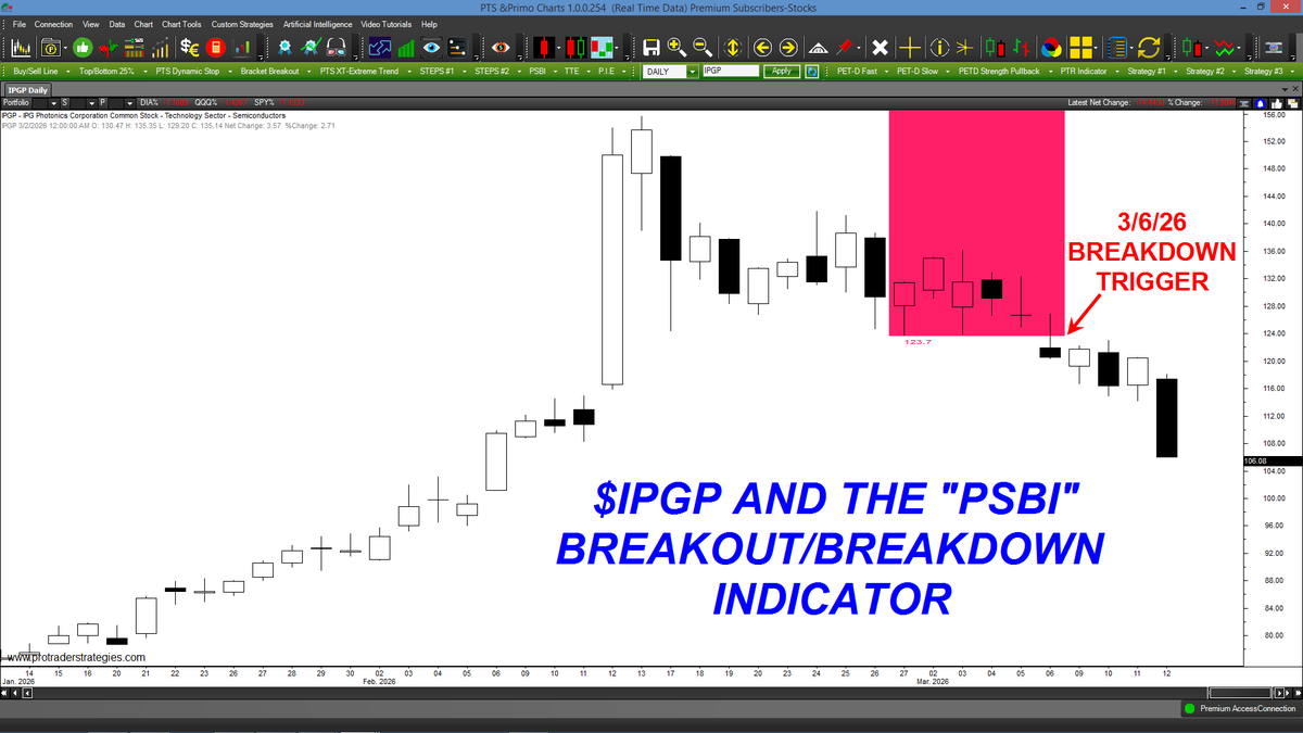 THE PRICE OF $IPGP CONTINUES TO FALL AFTER THE "PSBI" TRIGGERED A BREAKDOWN. Stop wasting time & money on breakout/breakdown methods that just don't work. Contact http://ProTraderStrategies.com & start trading with the powerful "PSBI" today! (All signals for student education only)