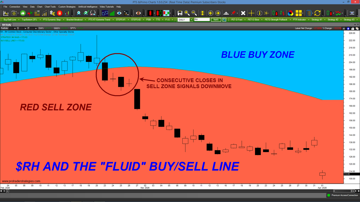 STUDENTS WHO APPLY OUR BUY/SELL LINE KNEW TO SELL/EXIT $RH +70 PTS HIGHER! Traders only lose money when they're out-of-sync w/ the market they're trading. Our Buy/Sell Line can help. Only on the PTS Primo Charts at http://ProTraderStrategies.com (All signals for student education only)