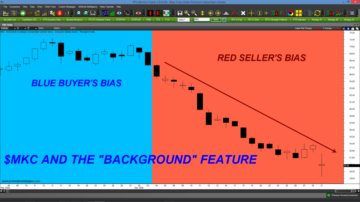 DO YOU THINK OUR "BACKGROUND" FEATURE COULD HAVE HELPED YOU TRADE $MKC? The "Background" Feature instantly identifies the "trading bias" of ANY market/time frame & can ONLY be found on the PTS Primo Charting Platform at http://ProTraderStrategies.com (Signals for student education only)
