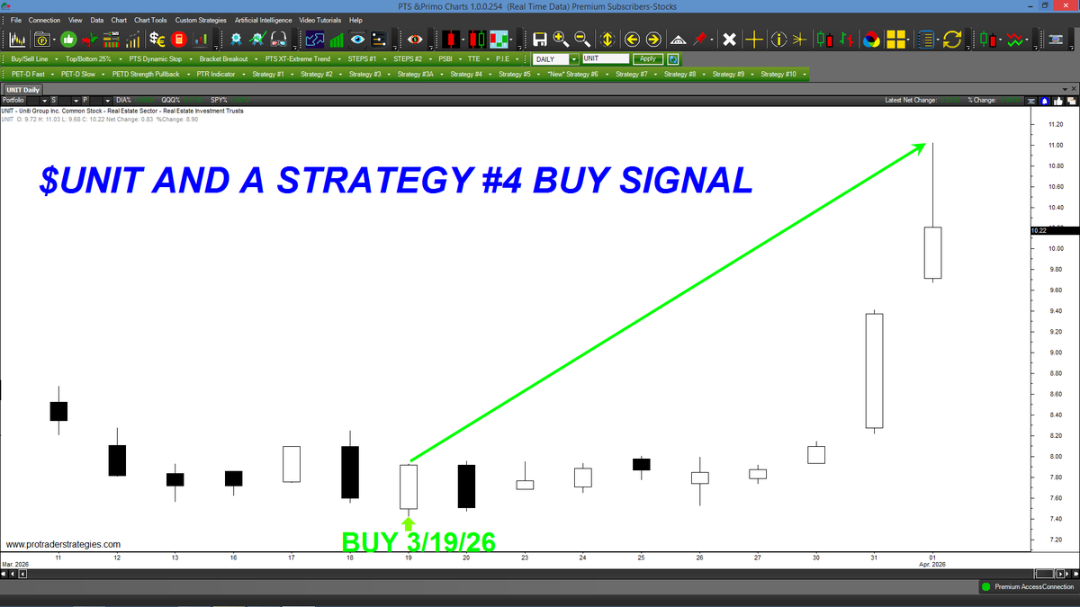 THE PRICE OF $UNIT HAS JUMPED +40% JUST TWO WEEKS AFTER A STRATEGY #4 BUY SIGNAL WAS GENERATED! This is a pattern recognition method that I have been applying for nearly 5 decades. Learn all of the rules ONLY at http://ProTraderStrategies.com (All signals for student education only)