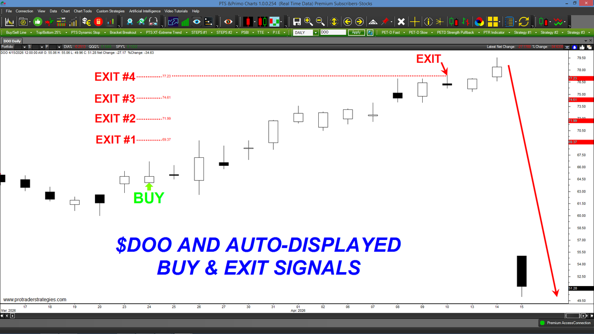 DO YOU THINK OUR TRADING METHODS COULD HAVE HELPED YOU TRADE $DOO? All of our strategies come equipped with auto-displayed buy & exit signals for ease of trading. Only on the PTS Primo Charts at http://ProTaderStrategies.com (All signals for student education only)