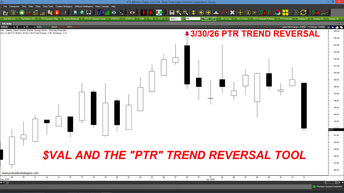 $VAL WAS DOWN SHARPLY YESTERDAY BUT THE "PTR" SIGNALED A TREND REVERSAL WEEKS AGO! The PTR was designed to identify the bar that a trend reversal is most likely to take place. Apply to ANY market/time frame & available ONLY at http://ProTraderStrategies.com (Signals for education only)