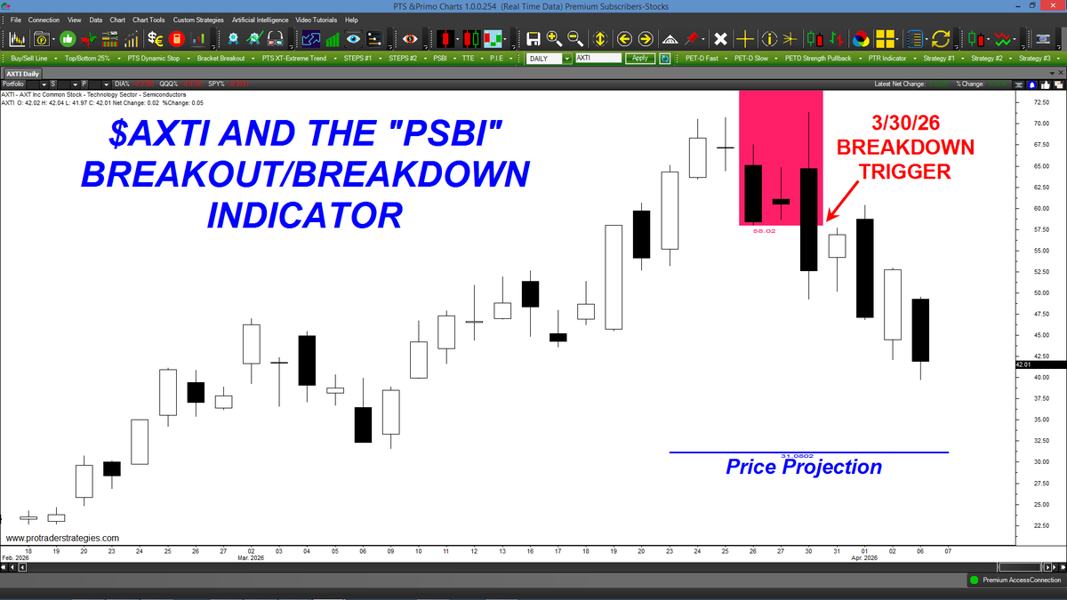 THE PRICE OF $AXTI HAS FALLEN OVER HALF THE DISTANCE TO IT'S "PSBI" PRICE PROJECTION. When price trades below the red "PSBI" area, a price projection is also displayed. Available ONLY on the PTS Primo Charts at http://ProTraderStrategies.com (All signals for student education only)