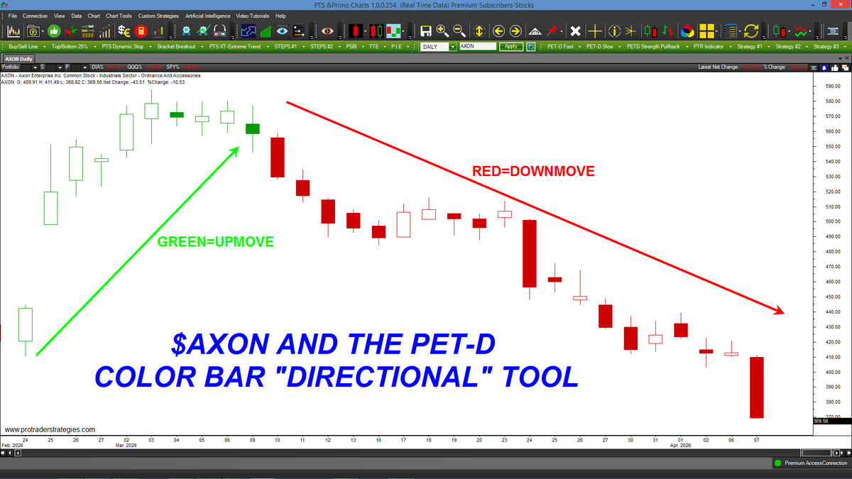 OUR PET-D COLOR BAR TOOL SIGNALED A DOWN-MOVE IN $AXON A MONTH AGO! This tool was designed to identify the short-term trend of ANY market or time frame. Contact http://ProTraderStrategies.com & get the PET-D color bar tool today! (All signals for student education only)
