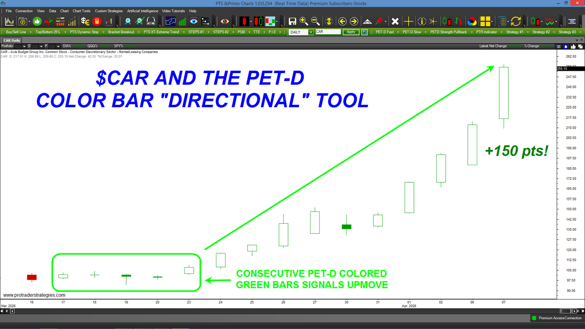 THE PRICE OF $CAR HAS SOARED +150 PTS SINCE THE PET-D SIGNALED AN UP-MOVE! 3-5 consecutive PET-D colored green bars signals an up-move in ANY market or time frame. Available ONLY at http://ProTraderStrategies.com (All signals for student education only)