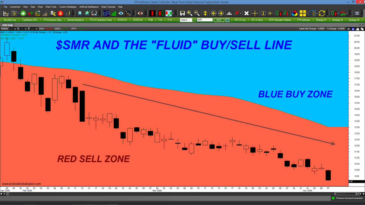 DESPITE TODAY'S UP MARKET, $SMR REMAINS IN AN OVERALL DOWNTREND. Why do traders continue to buy as a stock goes lower? Trading with our "Fluid" Buy/Sell Line can help get you in sync with whatever market you're trading. Only at http://ProTraderStrategies.com (Signals for education only)