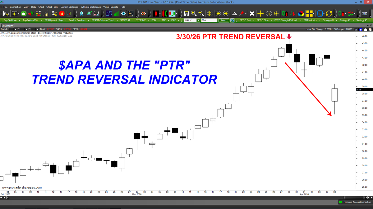 THE "PTR" SIGNALED A TREND REVERSAL AT THE TOP OF $APA! Are you ready to take your trading to the next level? Contact http://ProTraderStrategies.com and ask about our powerful new "PTR" tool for ALL markets (All signals for student education only)