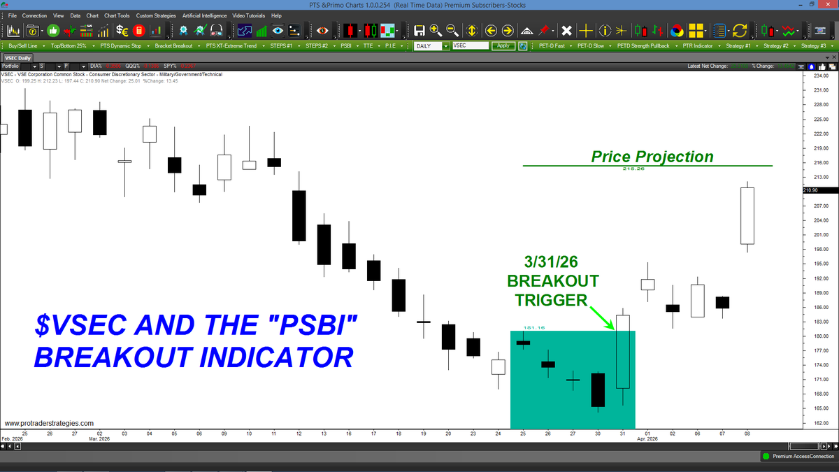 THE PRICE OF $VSEC HAS NEARLY REACHED IT "PSBI" PRICE PROJECTION IN JUST 1 WEEK! A price projection is auto-displayed once price trades above the green breakout area. Only on the PTS Primo Charting Platform at http://ProTraderStrategies.com (All signals for student education only)