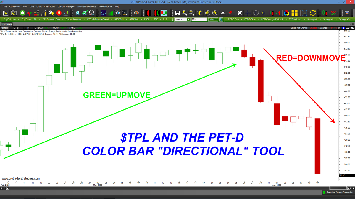 OUR PET-D STUDENTS KNEW TO SELL/EXIT $TPL WEEKS AGO. 3-5 consecutive PET-D colored red bars signals a down-move in ANY market/time frame. Available ONLY at http://ProTraderStrategies.com (All signals for student education only)