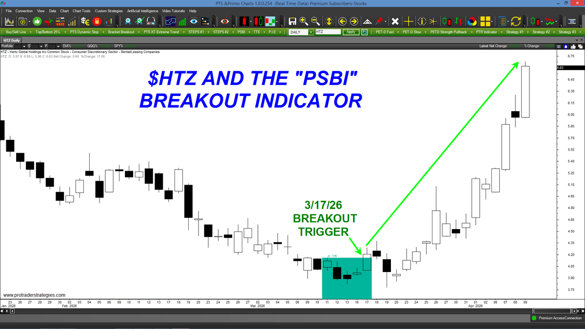 ANOTHER WINNING "PSBI" BREAKOUT, THIS TIME IN $HTZ! Our students around the world love this indicator because of it's simplicity: buy when price trades above the green displayed area-that's it! Only on the PTS Primo Charts at http://ProTraderStrategies.com (Signals for education only)