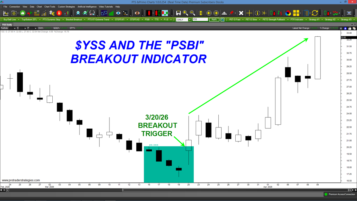 DID YOUR INDICATOR TRIGGER A BREAKOUT IN $YSS LAST MONTH? THE "PSBI" DID! Still struggling with your trading? Not seeing the type of results you were promised? Contact http://ProTraderStrategies.com & take charge of your trading today with the "PSBI" (All signals for education only)