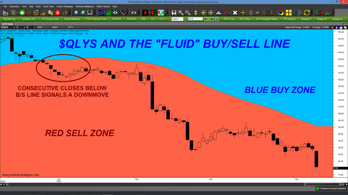 WHY DO TRADERS CONTINUE TO BUY $QLYS WHILE PRICE REMAINS IN THE SELL ZONE? You only lose money when you're out-of-sync with whatever market you're trading. Our "Fluid" Buy/Sell Line can help. ONLY on the PTS Primo Charts at http://ProTraderStrategies.com (All signals for education only)