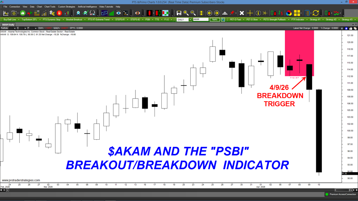 ANOTHER WINNING "PSBI" BREAKDOWN SIGNAL, THIS TIME IN $AKAM! Our students around the world love this indicator because of it's simplicity: sell when price trades below the red displayed area-that's it! Only on the PTS Primo Charts at http://ProTraderStrategies.com(Signals for education)