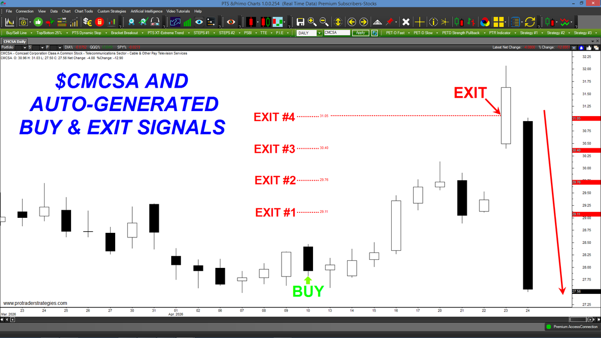 DO YOU THINK OUR TRADING METHODS COULD HAVE HELPED YOU TRADE $CMCSA? All of our strategies come equipped with auto-displayed buy & exit signals for ease of trading. Only on the PTS Primo Charts at http://ProTaderStrategies.com (All signals for student education only)