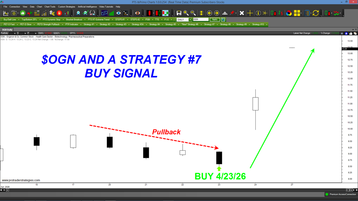 "PULLBACK" STRATEGY #7 CAUGHT THE LOW IN $OGN LAST WEEK! Stratey #7 is one our premier methods designed to generate buy signals at or near the most recent lows. Available ONLY at http://ProTraderStrategies.com (All signals for student education only)