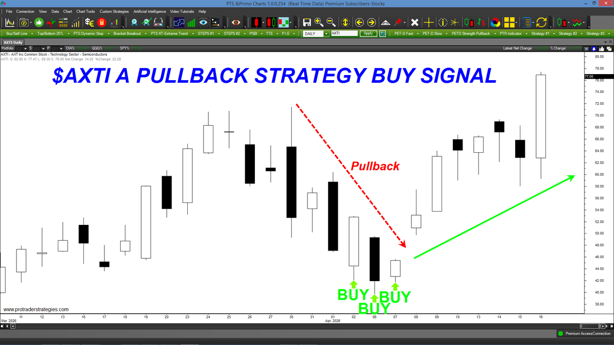 ONE OF OUR PULLBACK STRATEGIES CAUGHT THE MOST RESENT LOWS IN $AXTI. "Pullback" method have shown to generate buy signals at or near the lows in all markets & time frames. Contact http://ProTraderStrategies.com & start trading "Pullbacks" today! (All signals for student education only)