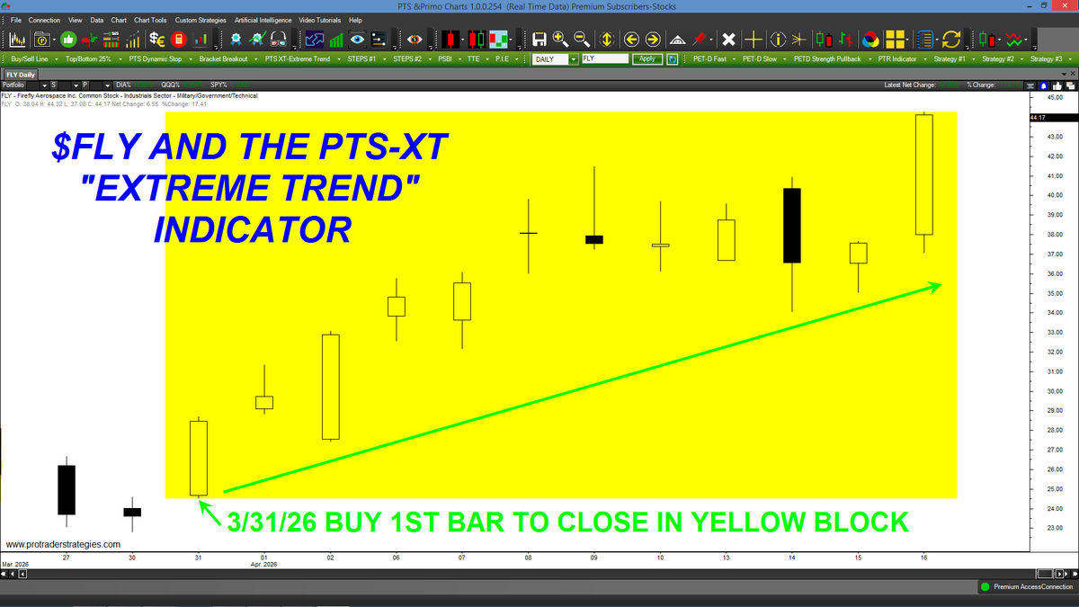 THE PRICE OF $FLY CONTINUES TO RISE BUT OUR PTS-XT INDICATOR GENERATED A BUY SIGNAL WEEKS AGO! Traders love this trending tool because of it's simplicity: buy the 1st bar to close in the yellow block - that's it! Only at http://ProTraderStrategies.com (All signals for education only)
